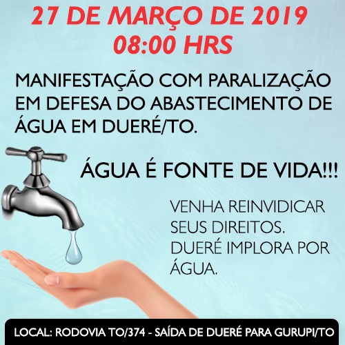 Dia 27 de março, quarta-feira, às 8h, a população de Dueré, realizará uma manifestação reivindicando a solução definitiva para o problema de falta de abastecimento de água, por quase oito anos, serviços que deveria ser executado pela Agência Tocantinense de Saneamento (ATS), empresa responsável pelo serviço, que recorreu da ação pública deferida pelo Juiz Dr. Nassib Mamud.