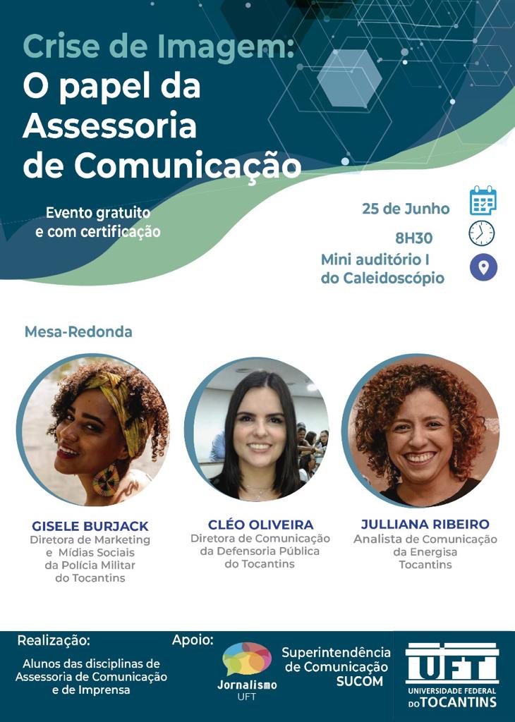 Na terça feira, 25, a partir das 8h30 acontecerá no mini auditório I (Laboratório de Jornalismo Caleidoscópio UFT) um evento que contará com mesa-redonda com o tema Crise de Imagem: O Papel da Assessoria de Comunicação. O evento conta com a participação especial de três jornalistas renomadas do Estado, Gisele Burjack, Diretora de Marketing e Mídias Sociais da Polícia Militar do Tocantins, Cléo Oliveira, Diretora de comunicação da Defensoria Pública e Juliana Ribeiro Analista de Comunicação da Energisa.
