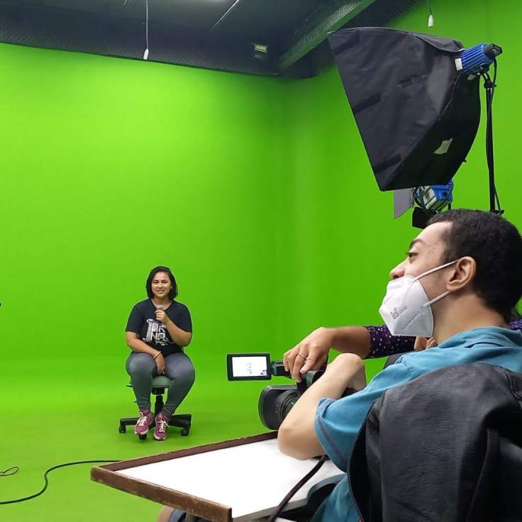 Matheus, durante estágio obrigatório realizado na TV Unitins; no laboratório de TV do curso de Jornalismo sendo acompanhado pelo avô e na aula de Telejornalismo.