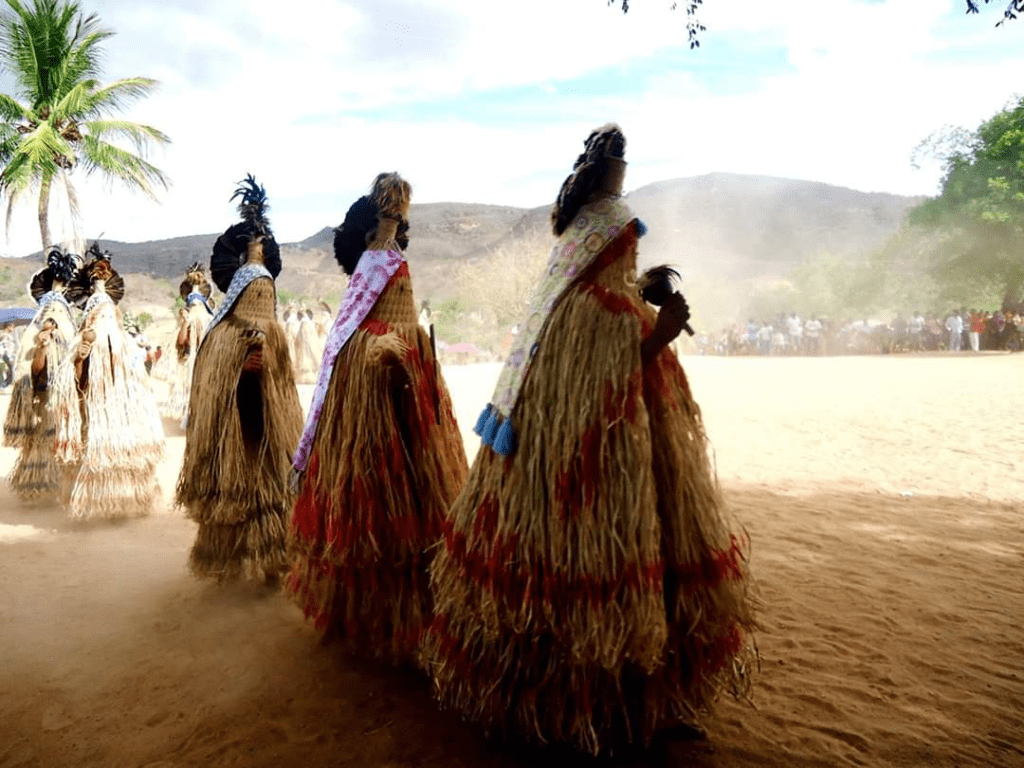 Acima o Pankararu: A ancestralidade rege a fé e a força do povo personificada nos Praiás, indígenas cobertos de fibra de caroá, que conduzem o Toré ao som dos toantes e maracás.