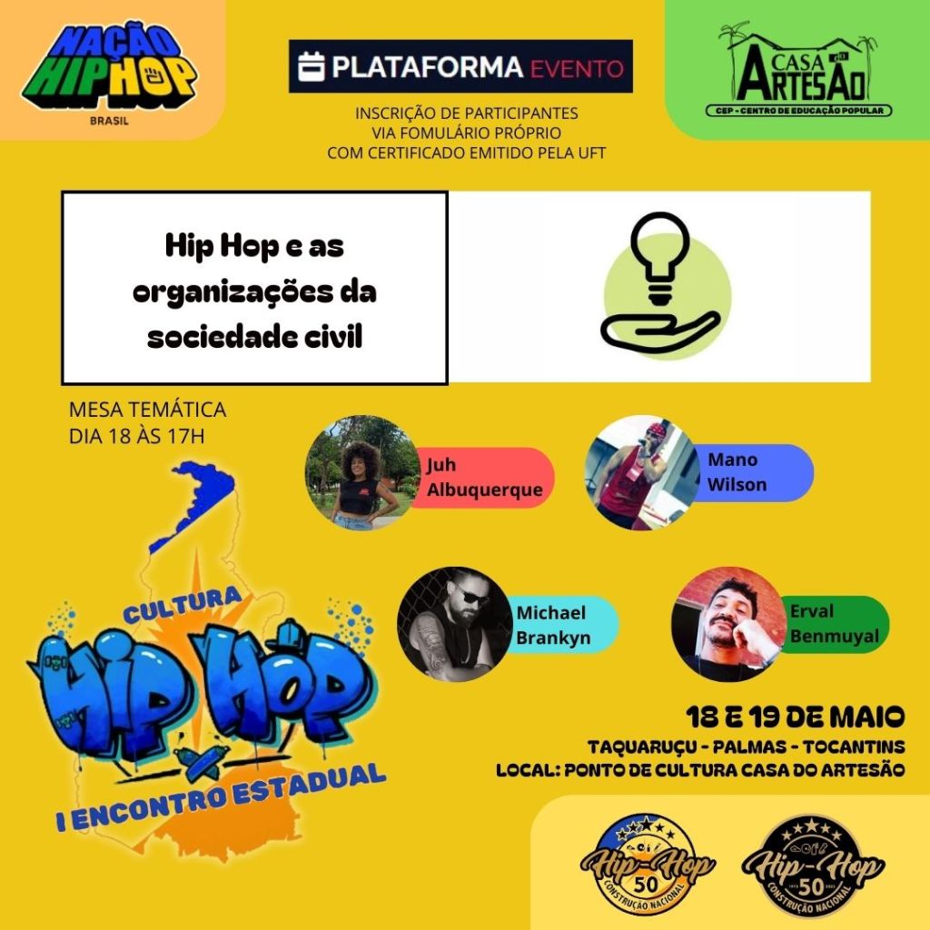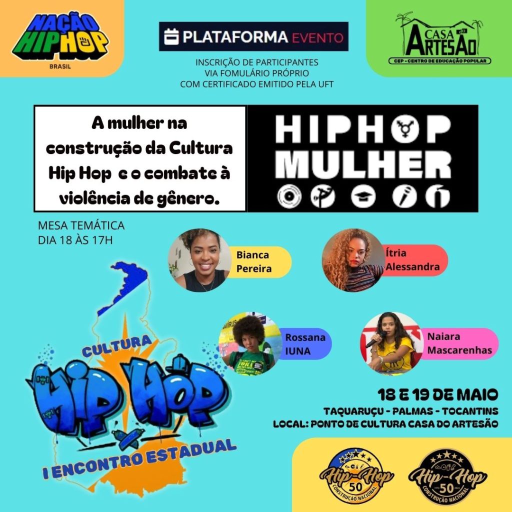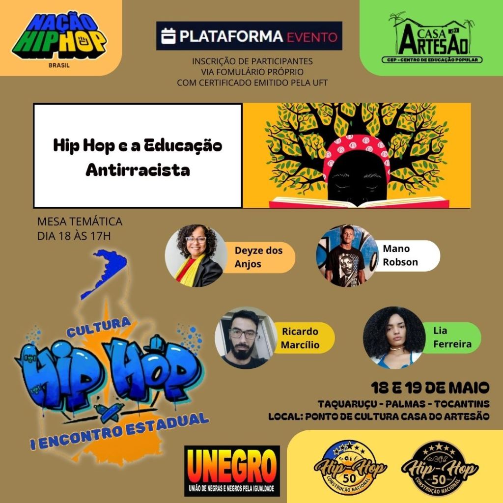 Organizado pelo Movimento Hip Hop do Tocantins em colaboração com o Ponto de Cultura Casa do Artesão de Taquaruçu (CEP), o evento promete ser uma celebração vibrante da arte, da música e do ativismo social destacando a contribuição para a cultura Hip Hop.