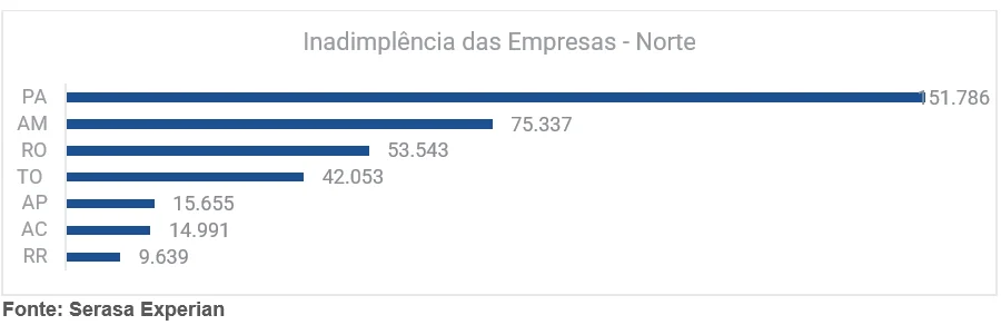 A quarta posição chama a atenção pelo fato de ser a unidade federativa mais nova do país, ou seja, grande potencial de crescimento, mas com grande percentual de inadimplência. Confira no gráfico abaixo, os estados do norte do país e os números de empresas inadimplentes.
